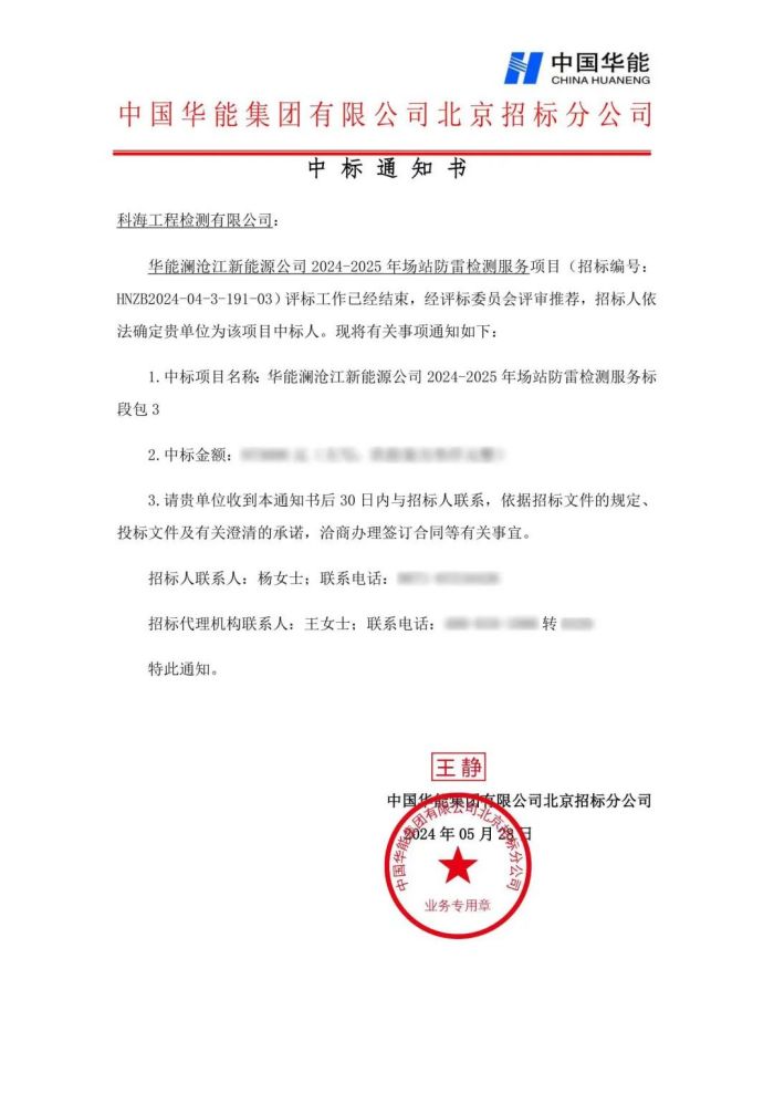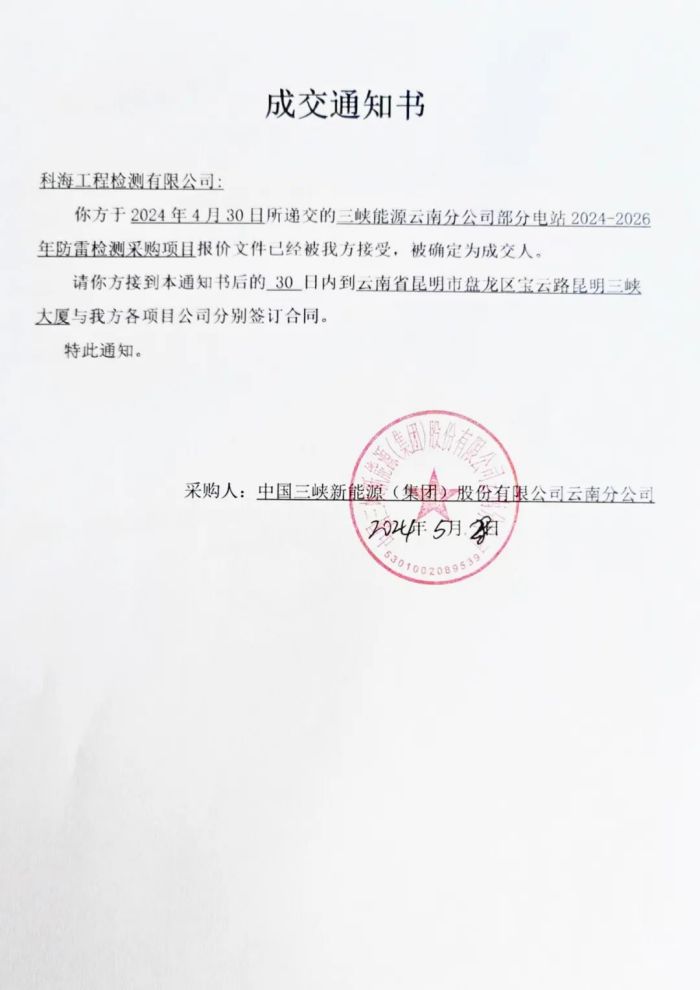 追風趕月莫停留,平蕪盡處是春山。近日,公司經營捷報頻傳,喜訊連連,成功中標“華能瀾滄江新能源公司防雷檢測”、“三峽能源云南分公司防雷檢測采購”兩個項目,實力再獲市場認可。